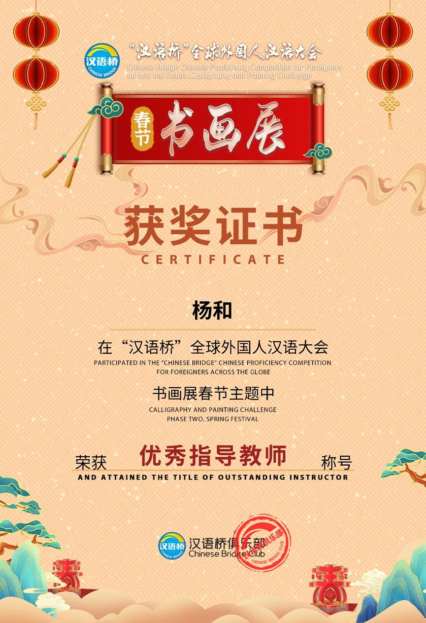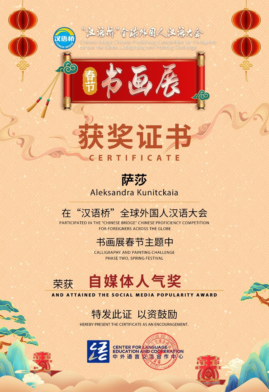 Learn Chinese characters, improve Chinese, meet friends with literature, and build dreams with painting. On February 27, the organizing committee of calligraphy and painting Exhibition of 2022 "Chinese Bridge" Global Chinese Language Conference for Foreigners announced the winning works of "Spring Festival" theme. The calligraphy work "Jade Rabbit Is Blessing" by Sasha, a Russian student of SXPI in 2022, won the "Social Media Popularity Award", and Yang He, a teacher from the School of International Education, won the title of "Outstanding Instructor".