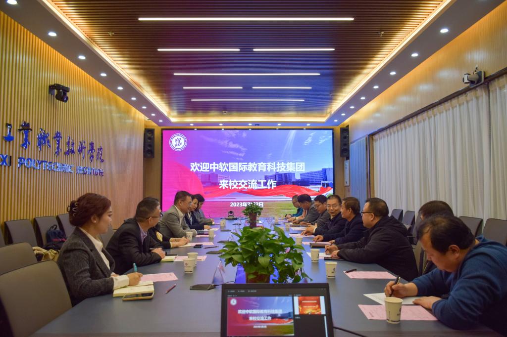 Secretary Hui Zhaoyang first welcomed Ma Xiaoming and Cheng Huan on behalf of SXPI. After watching SXPI Promotion video, Hui Zhaoyang focused on the evaluation of "four qualities and three breakthroughs" proposed by Vice-Premier Sun Chunlan during her visit to SXPI, introduced the general situation, the characteristics of vocational education, and the philosophy of SXPI in detail. Based on SXPI school-enterprise cooperation, industry-education integration works, combined with education chain, talent chain, industrial chain, innovation chain, Hui Zhaoyang shared the ideas of school-enterprise cooperation. He pointed out that the higher vocational education development should be guided by the spirit of the 20th CPC National Congress, focused on the national emerging strategic industries, the future industries layout, the dynamic adjustment mechanism should be contentiously improved, the major structure should be optimized, the vocational education should be solid connected with significant industrial strategies. Finally, he hoped to take this exchange as an opportunity to further promote the in-depth cooperation between SXPI and Chinasoft International Education Technology Group.