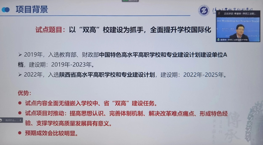 On Oct 28, Shaanxi Provincial Department of Education held a video conference to evaluate the pilot project of the reform of education opening to the outside world. SXPI is evaluated by the professional group as a pilot school. At the evaluation meeting, Qin Jingjun, Dean of the School of International Education, on behalf of SXPI, introduced the basic information of the pilot project of "Comprehensively promoting the internationalization of SXPI with the construction of 'double-high' as the starting point" from the aspects of the project implementation background, main tasks, resource guarantee, initial results, etc.