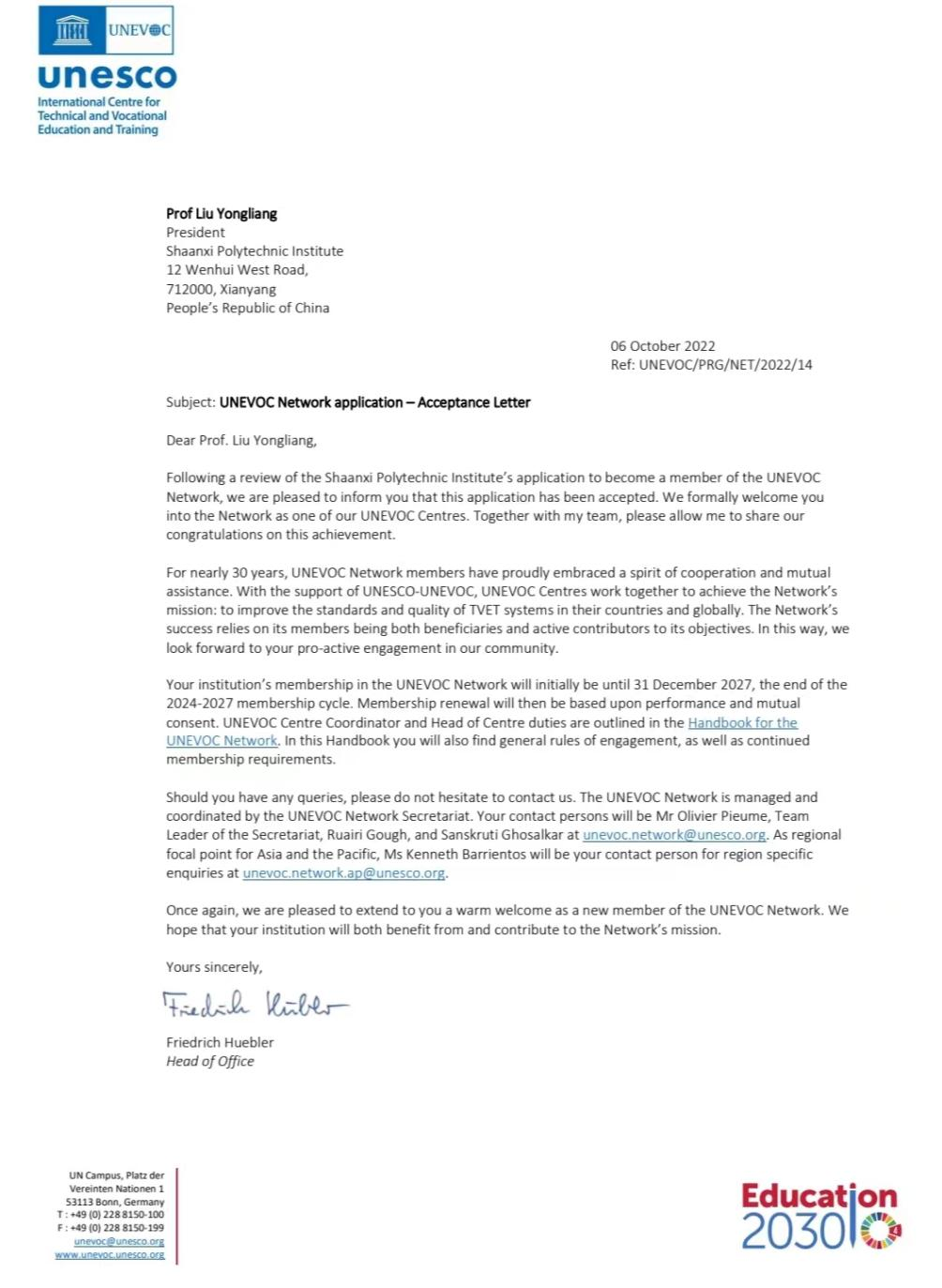 On October 25, Professor Shahbaz Khan, Director of UNESCO Beijing Office in China, sent a congratulatory letter to SXPI and extended warm congratulations on SXPI as the UNESCO-UNEVOC contact center in China. He said that the mission of UNESCO Organizations was in line withthe United Nations’ Framework for Sustainable Development Cooperation (2021-2025). Technical and vocational education and training (TVET) and skills development were strategic priorities for the UNESCO. He looked forward to working closely with SXPI to promote the TVET and skills development agenda in China.
