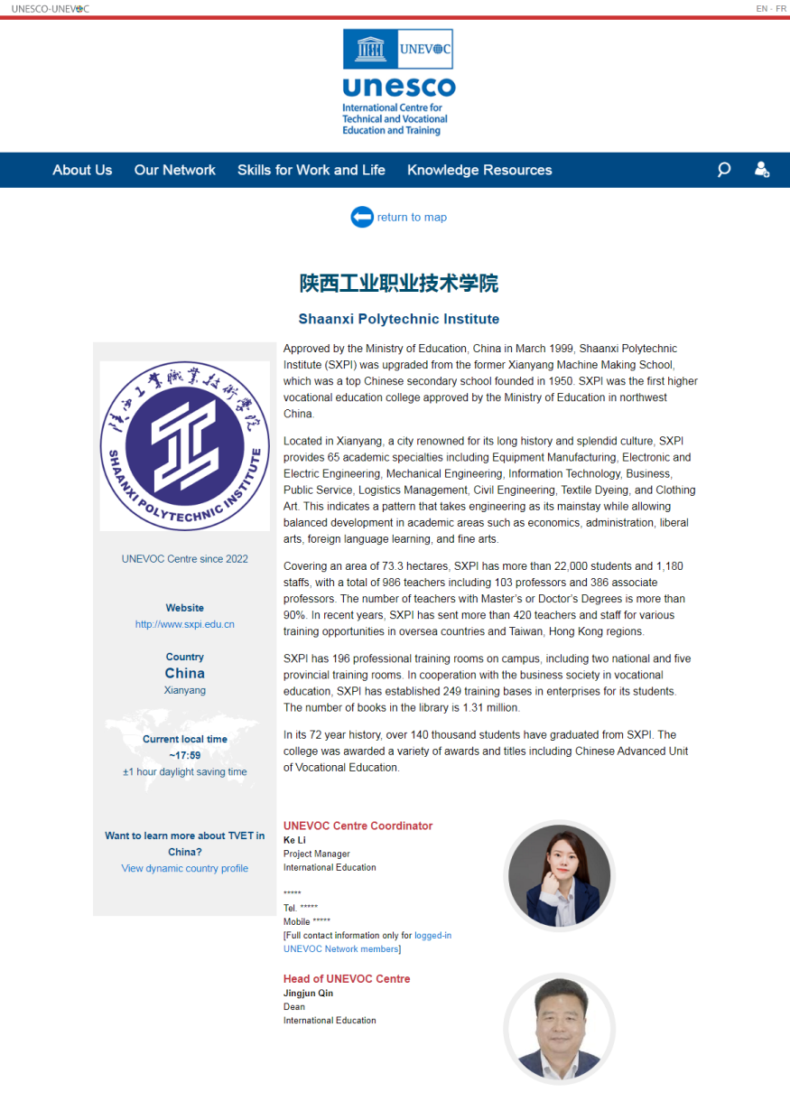 Recently, UNESCO International Center for Technical and Vocational Education and Training (UNESCO-UNEVOC) officially approved Shaanxi Polytechnic Institute (SXPI) as the organization's center in China. SXPI became the first TVET institution in the central and western regions of China to join the UNEVOC Network.