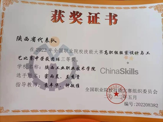 From August 23 to26, 2022 National Vocational Colleges Skills Contest (higher vocational group), the Costume Design and Technology Category, was held in QingdaoTechnical College. A total of 47 teams across China participated in the competition. Yuan Fenghua and ZhongMinwei, the teaching team of SXPI Chemical Engineering and Clothing School, instructed the students Lan Xiugui and Dou Yuchen majoring in Fashion and Costume Design, won the third prize.