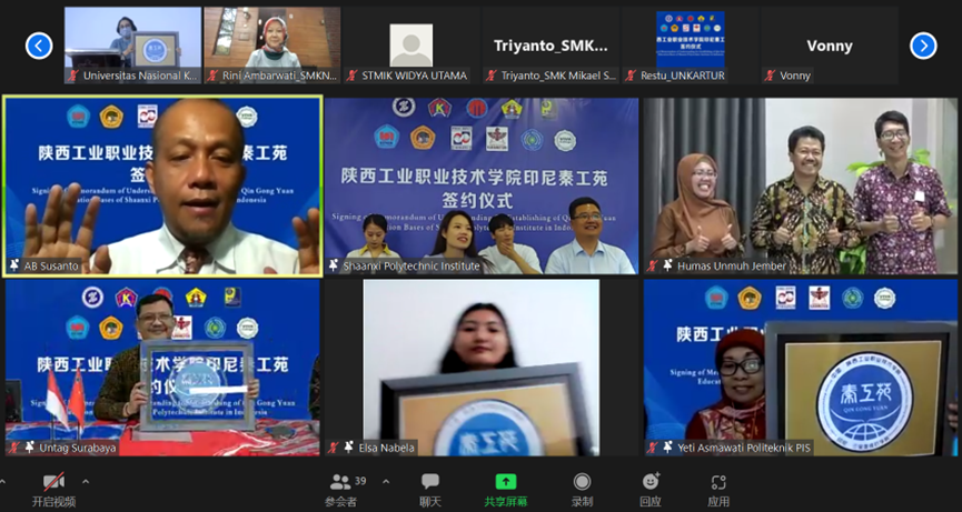 On the afternoon of July 7th, the preparatory meeting for the establishment of Qin Gong Yuan of Indonesia Branch school of SXPI was held by video conference. Dr. Diah Sawitri, Director of vocational Education Program, Department of Education, East Java, Indonesia, attended the meeting and delivered a speech. Mr. Yu Yougen, Deputy Secretary General of China Education Association for International Exchange, delivered a video speech. Principals of the 10 Indonesian universities co-built by Qin Gong Yuan attended the meeting.