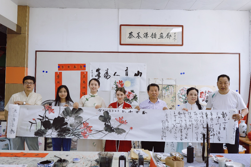 International students took a group photo with the teachers of painting and calligraphy