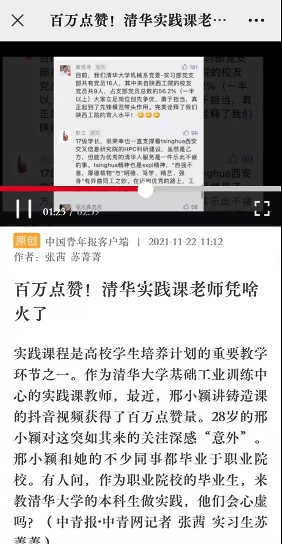 Since 2008, the Industrial Training Center of Tsinghua University started the recruitment in SXPI. 12 graduates from SXPI have been working in it, involving machinery, CNC, material, welding, and other fields. They have become the backbone of the center. In addition, there are a number of graduates working as the instructors in Beihang University, Zhejiang University of Technology and other universities. Meanwhile, China Youth Daily, Huanqiu, Huashang, Shaanxi Provincial Education Department official account and other media have reported them.