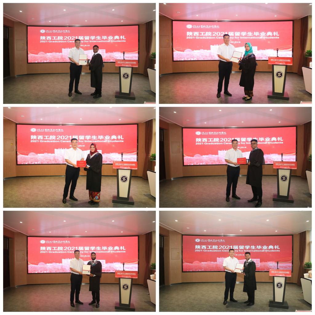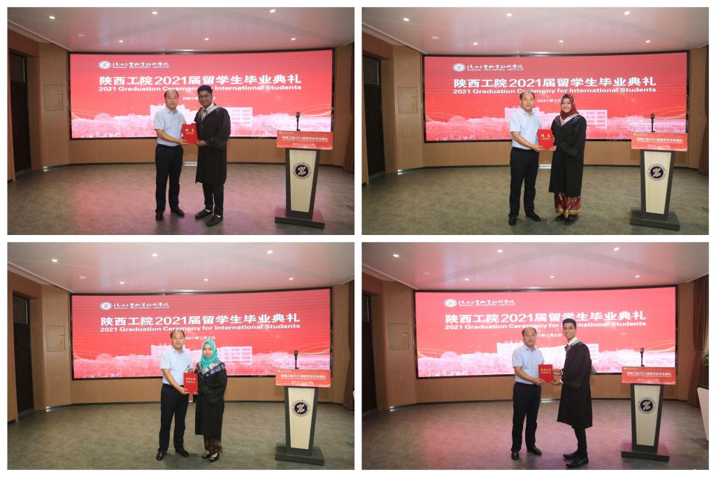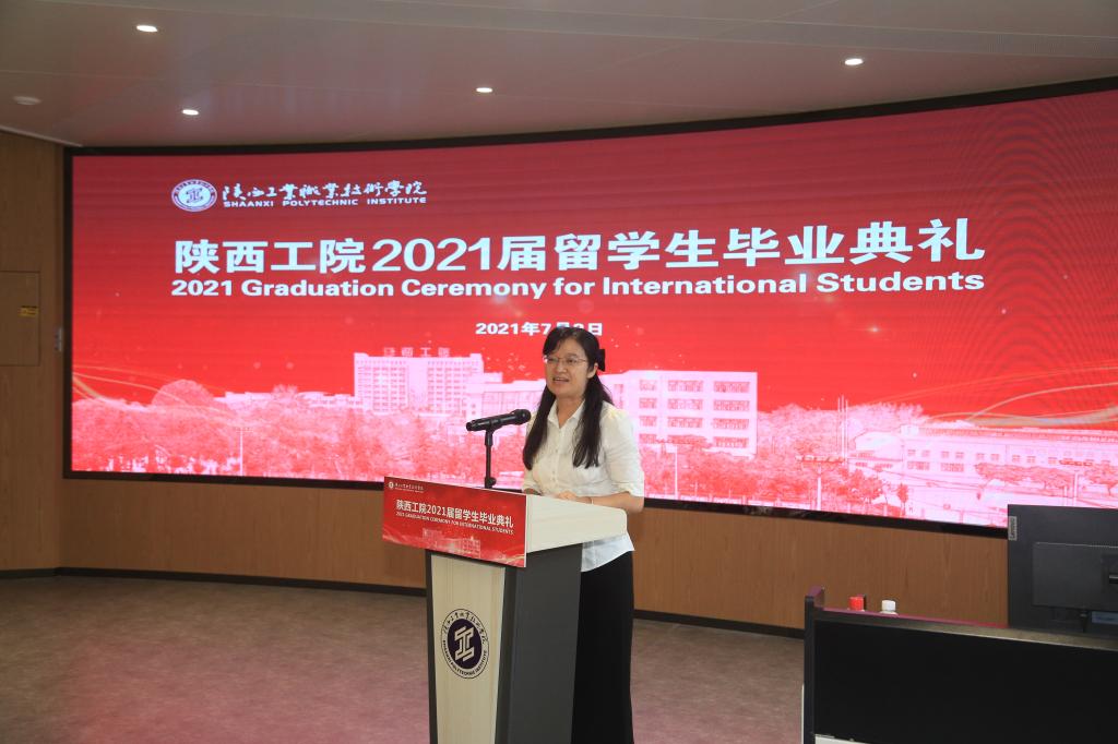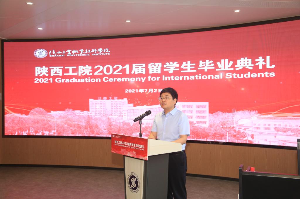On July 2, SXPI held the 2021 graduation ceremony for international students on the third floor of Chongwen building. SXPI President, Liu Yongliang, Vice President, Mei Chuangshe, Deputy Party Secretary, Tian Hao and Director of the Confucius Institute Management Office of Chang’an University, Fan Xing, attended the ceremony. Corresponding leaders from SXPI Academic Affairs Office, Logistics Office, Finance and Economics School, Mechanical Engineering School, Electrical Engineering School, Trade and Circulation School, International Education School, representative teachers and all the international students participated in the ceremony. At the same time, the family members of the international students also witnessed and shared the happy moments through live-streaming video. Mr. Tian Hao presided over the meeting.