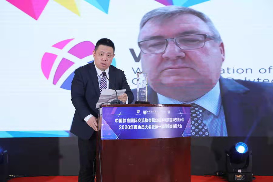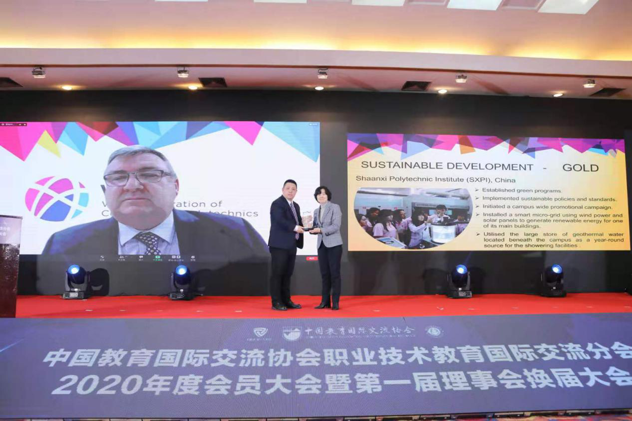 On November 27, the World Federation of Colleges and Polytechnics (WFCP) hosted ceremony to present its fourth Awards of Excellence, recognizing leaders in the field of technical and vocational education and training.At the ceremony, SXPI won the gold award of the excellence on Education Sustainable Development. Duan Jun, SXPI Vice President, received the award from Ms. Shen Xuesong, WFCP Vice Chair and Vice Director of CEAIE at the physical meeting place in Nanjing. Duan Jun expressed the appreciation for the support of WFCP and said that SXPI would continue to promote the work on education sustainable development.