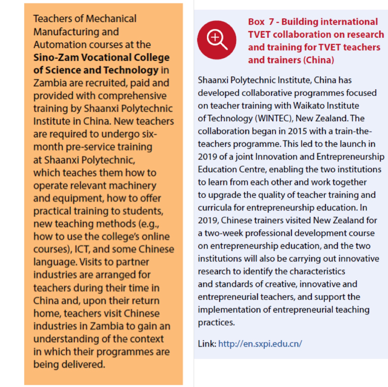 Still, in another report named “Future of TVET Teaching and Learning”, the branch campus in Zambia of SXPI is listed and presented as an example. Especially, the experience of school-enterprise cooperation model of SXPI in the training of Zambia teachers is fully introduced.