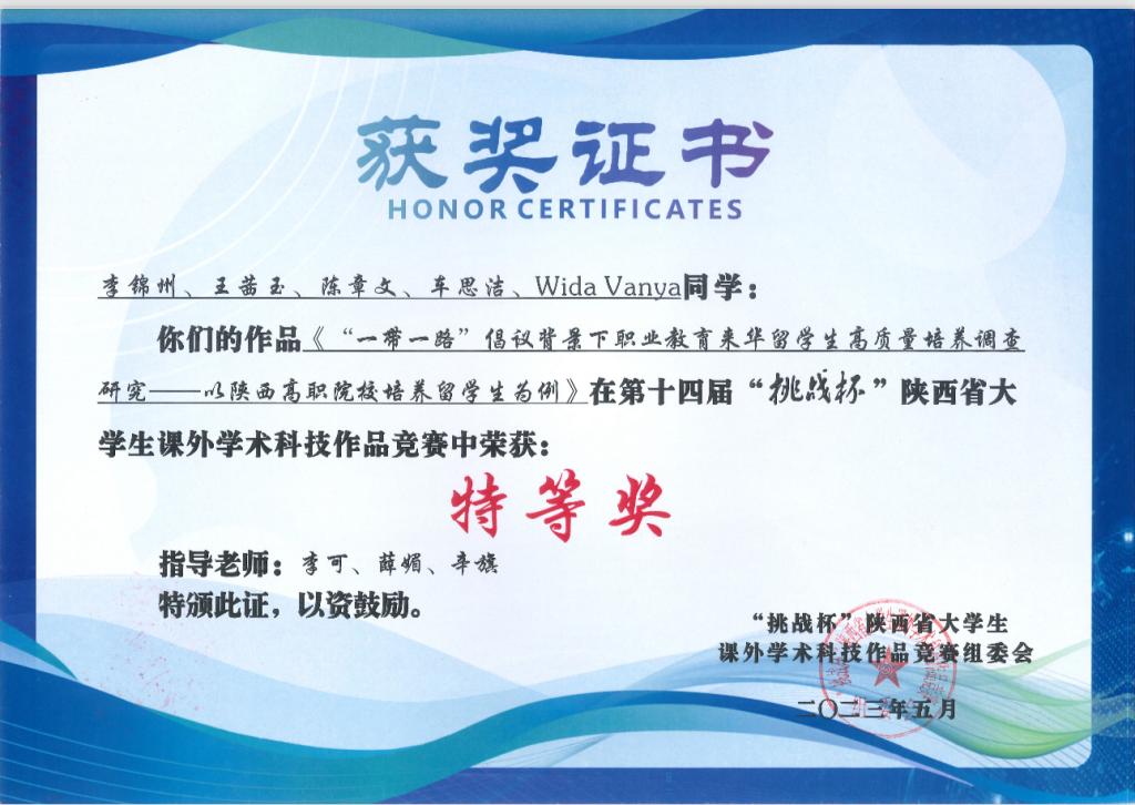 The "Challenge Cup", as one of the largest, highest standard, and most influential entrepreneurship competitions for Chinese college students, guides and inspires young people to continuously enhance their understanding of the national conditions and social conditions through extensive social practice and profound social observation. Currently, it has become an "Olympic" event for innovation and exchange among contemporary college students. The competition mainly includes three types of works: academic papers in natural sciences, social survey reports in philosophy and social sciences, and scientific and technological invention production. The award-winning work of the Grand Prize of SXPI justfocuseson the "development achievements" in the social survey report category of philosophy and social sciences. Based on the current situation and achievements of foreign students' education in Shaanxi higher vocational colleges,ittakesthe "the Belt and Road" initiative as the backgroundand comprehensively exploresthe high-quality development of foreign students' training in vocational education. The research report helps to enhance the internationalization level of vocational colleges and serves the national economic and social development.