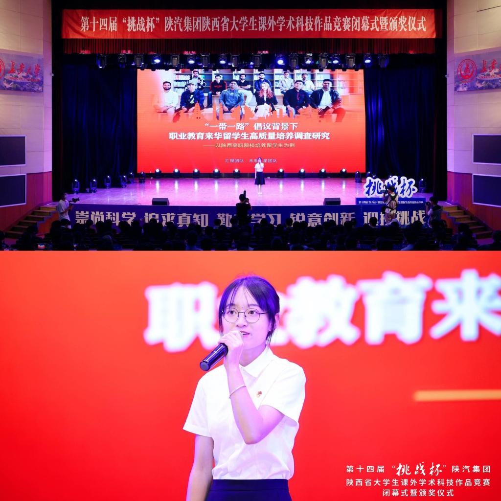 SXPI student's work"Investigation and Research on the High Quality Cultivation of Foreign Students in Vocational Education in China under the Background of the" the Belt and Road "Initiative - Taking the Cultivation of Foreign Students in Shaanxi Higher Vocational Colleges as an Example"guided by Li Ke, Xin Qi and Xue Mei won the grand prize, which has realized a breakthrough in the field of philosophy and social sciences since our school participated in the Challenge Cup.Especially, the work was invited as the only representativepiecceof vocational colleges in the province, and was presented at the competition award ceremonyas three well-known undergraduate colleges in Shaanxi province,receiving widespread praise and establishing a good "professional brand" for vocational colleges in-depth exploration in this field.