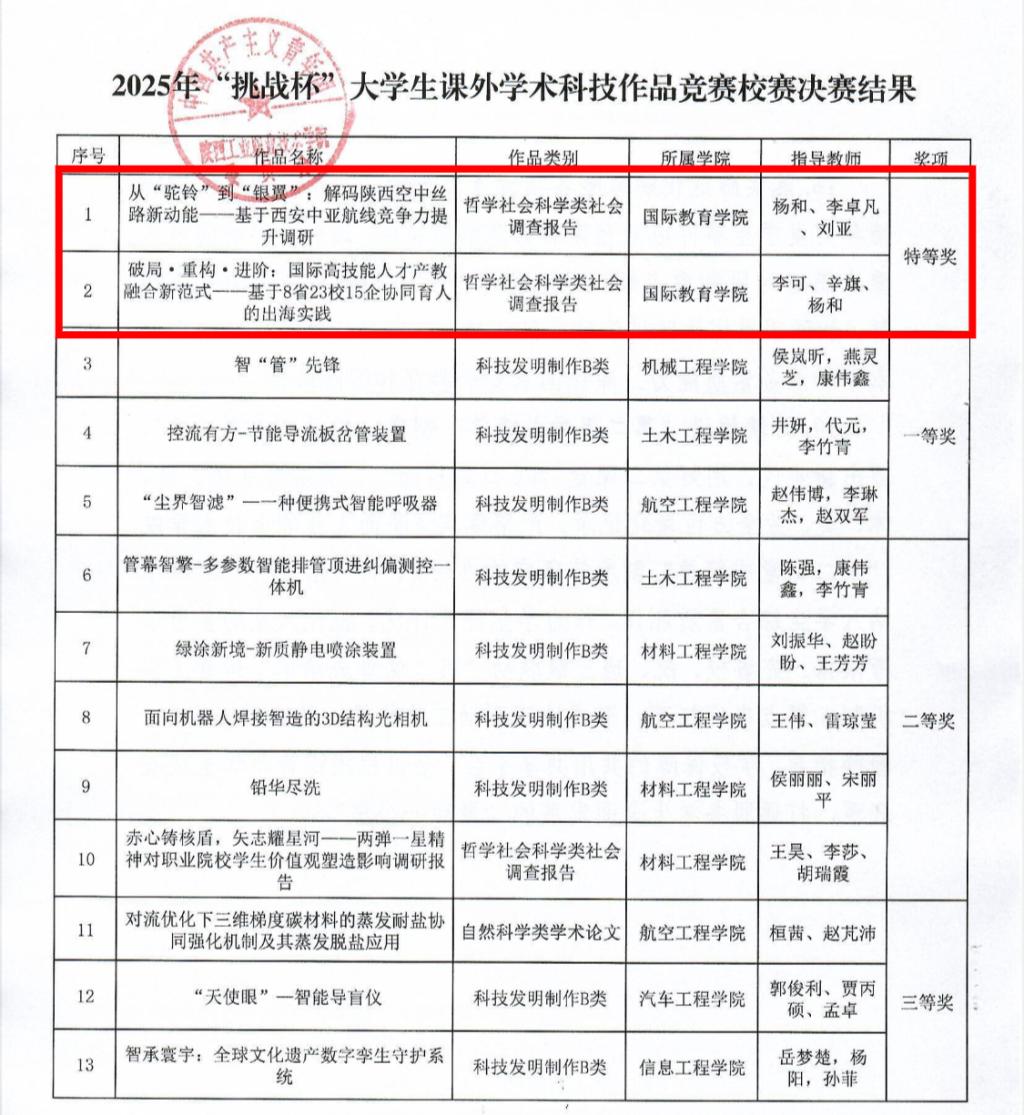 Two entries from the School of International Education clinched top honors. From Camel Bells to Silver Wings, guided by Yang He, analyzed Xi'an’s Central Asian air routes, while Breaking Barriers, mentored by Li Ke and Xin Qi, explored international talent co-cultivation models. Both works advance to the provincial round, set to spotlight student excellence regionally.