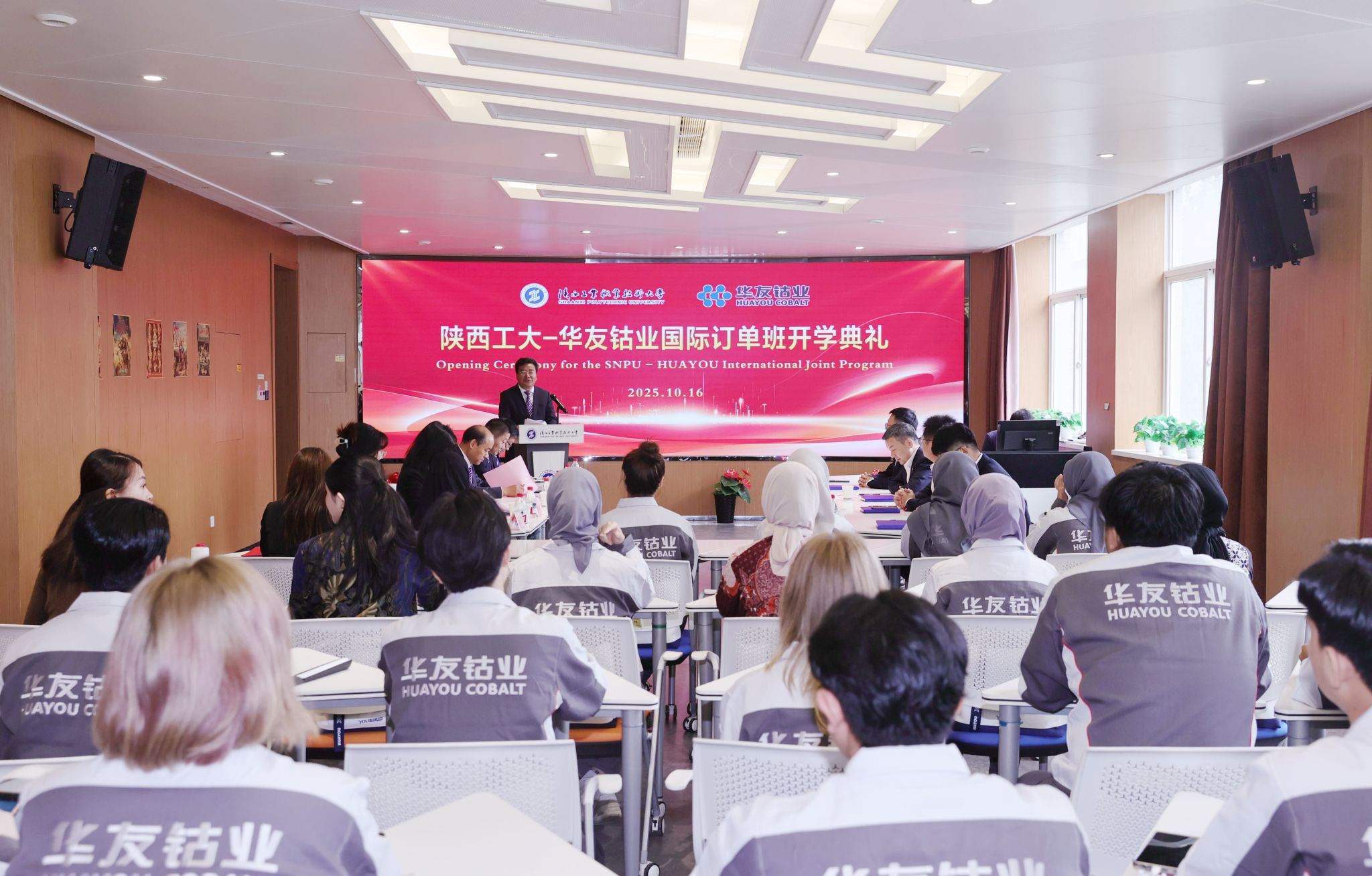 The opening ceremony of the Indonesia International Order Class, jointly established by Shaanxi Polytechnic University and Zhejiang Huayou Cobalt Co., Ltd., was successfully held at the Weicheng Campus on the morning of October 16. Li Qian, General Manager of the Human Resource Management Center of Huayou Cobalt Group, and Mei Chuangshe, Vice President of Shaanxi Polytechnic University, attended the ceremony and delivered speeches. Responsible persons from relevant departments of both the university and the enterprise, as well as all teachers and students of the Order Class, jointly witnessed this important moment of deepening industry-education integration and jointly cultivating international talents.