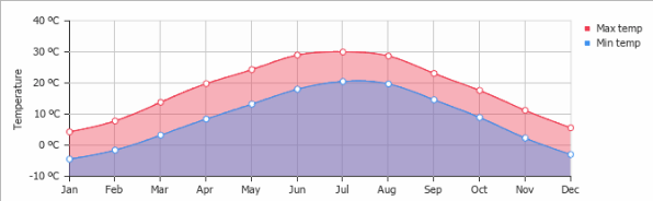 The graphs below show the monthly weather averages over the year. The hottest season/summer takes place in May, June, July and August, the months of January, February and December are very dry and cold.